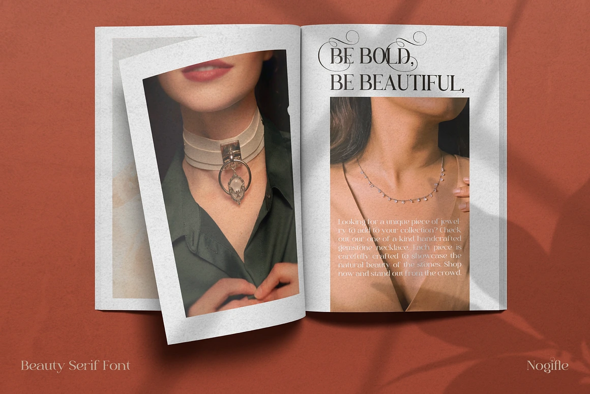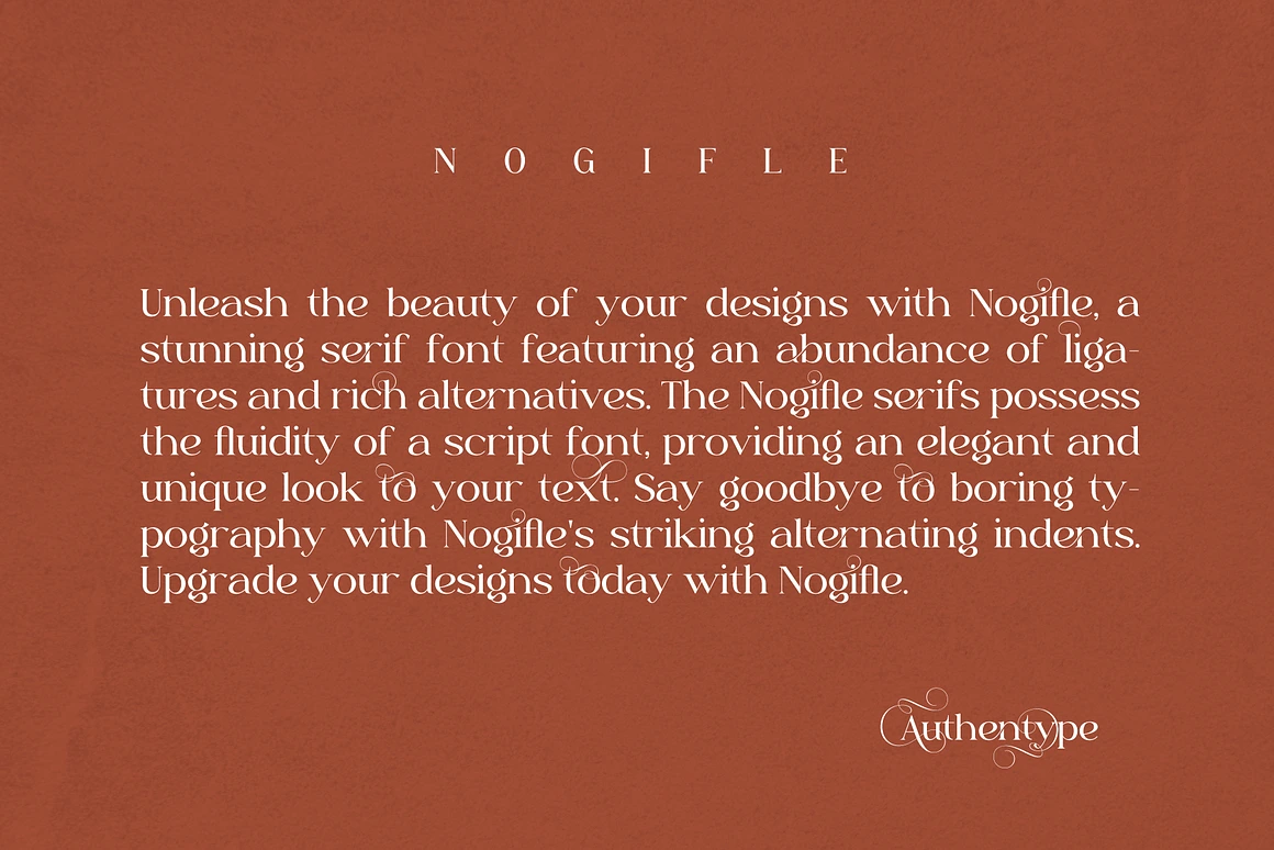 Say goodbye to boring typography with Nogifle’s striking alternating indents. Upgrade your designs today with Nogifle – the ultimate Beauty Serif Font for modern and classic aesthetics alike.