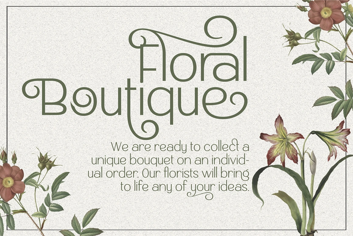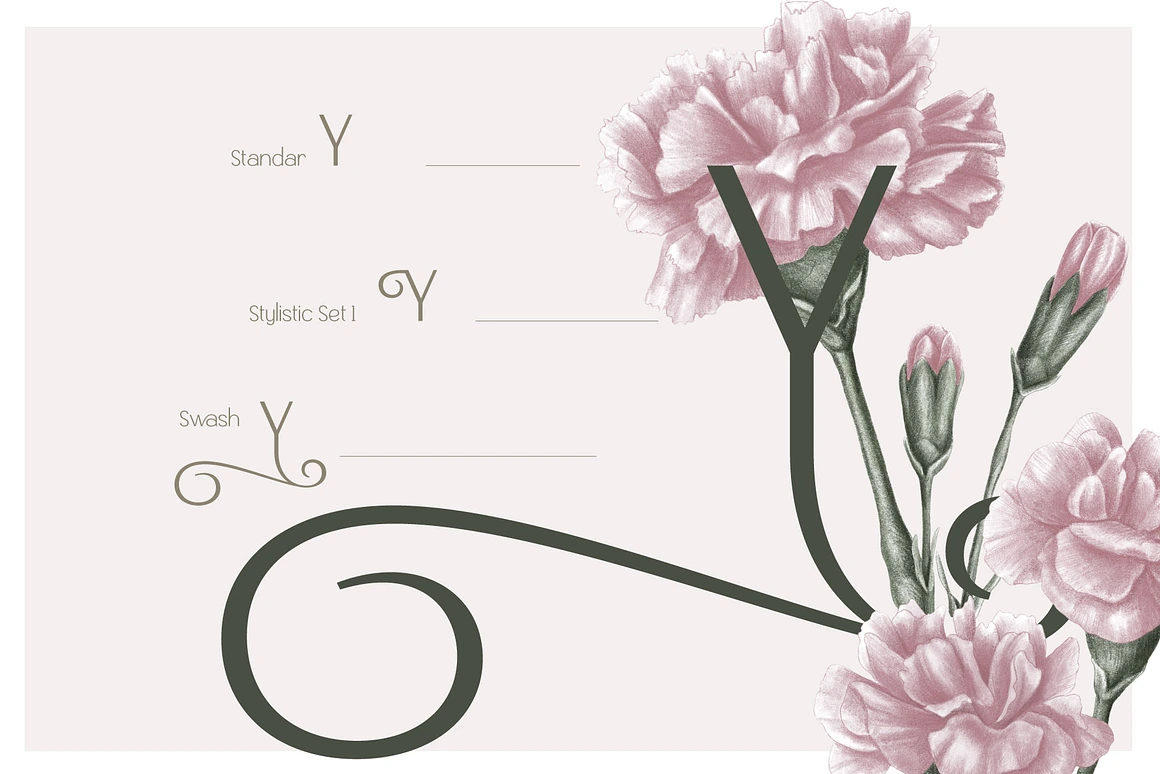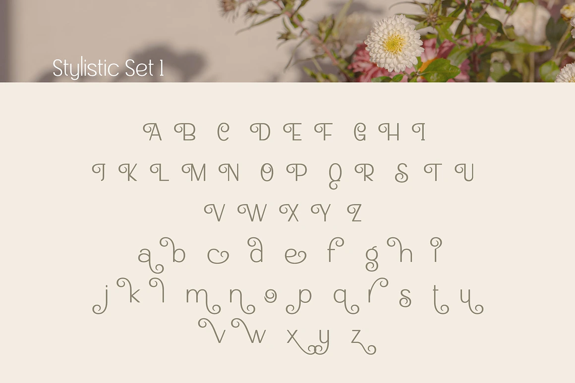 – Stylistic Set 1: Alternative characters with elegant curves for a more decorative appearance.