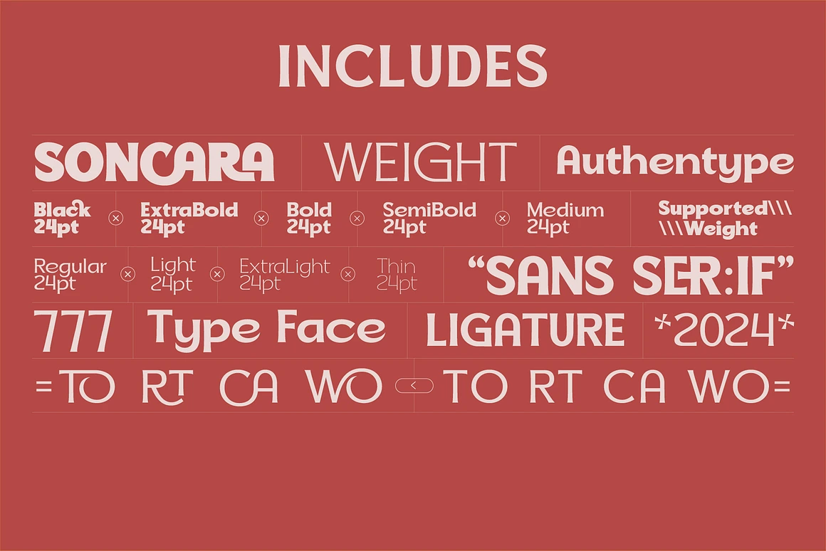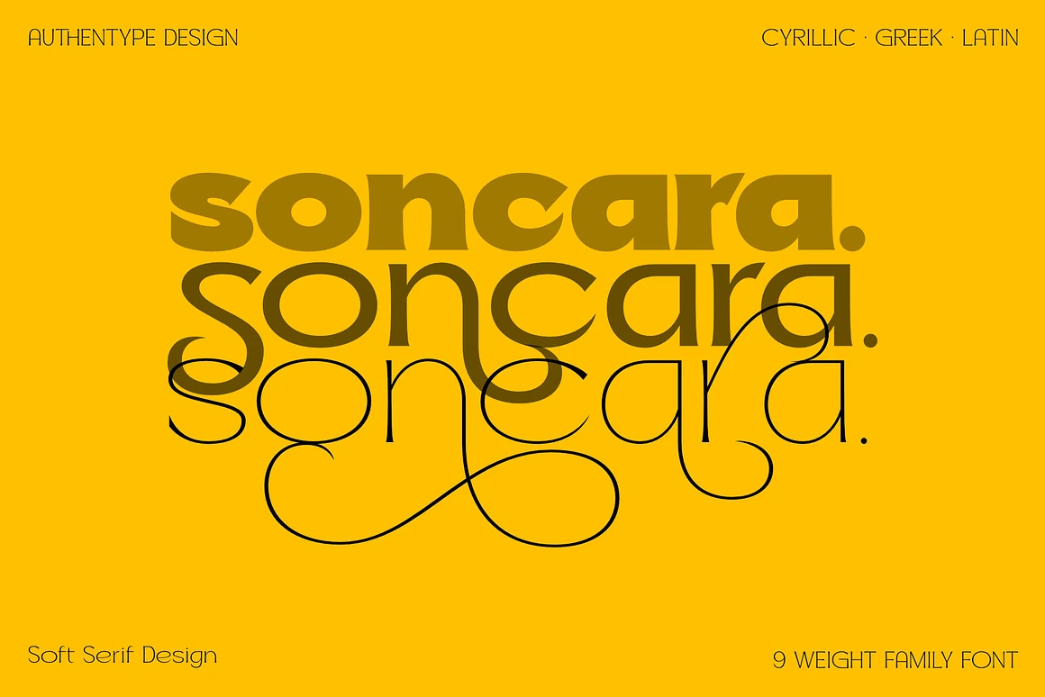 With multilingual support covering Latin, Greek, and Cyrillic alphabets, and versatile stylistic alternates, Soncara offers exceptional flexibility for global creative projects.
